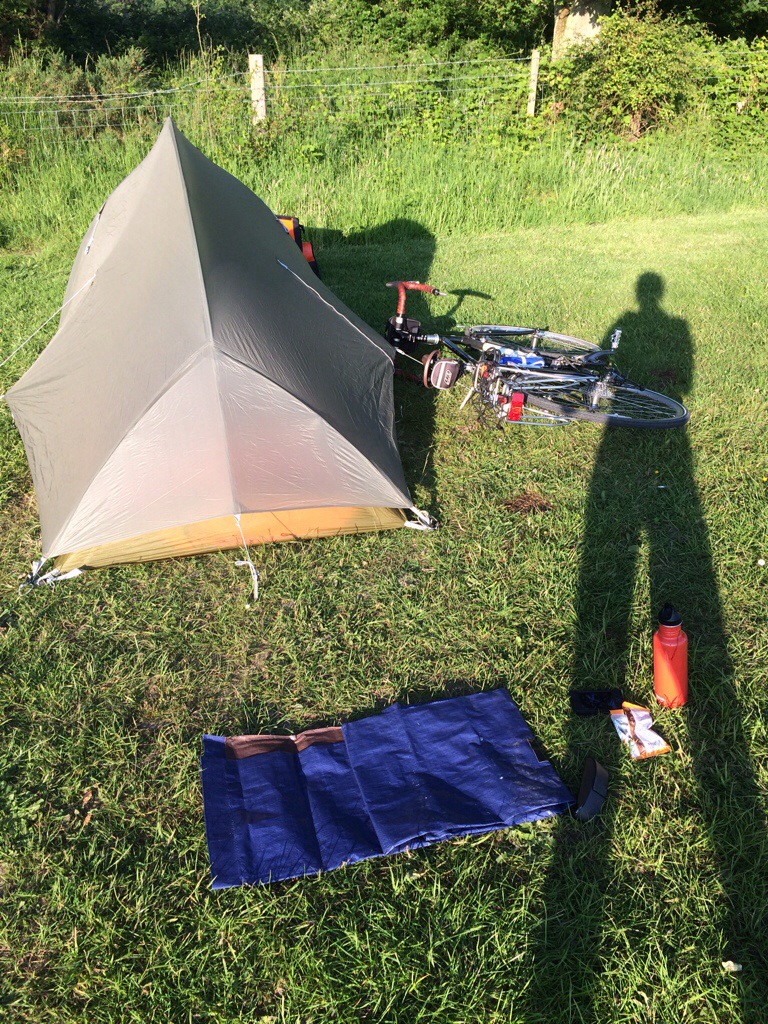 It was a beautiful evening – warm, and the sun still high in the sky at 8pm. I looked around the camp area and saw a good spot and headed for it. I also saw there were other cyclists in camp. I wasn’t alone. I pitched my tent and set up my few creature comforts. I was so high from the day. My bloody leg was like a badge. My heart was filled with the goodness of people. I was humble and grateful and happy.