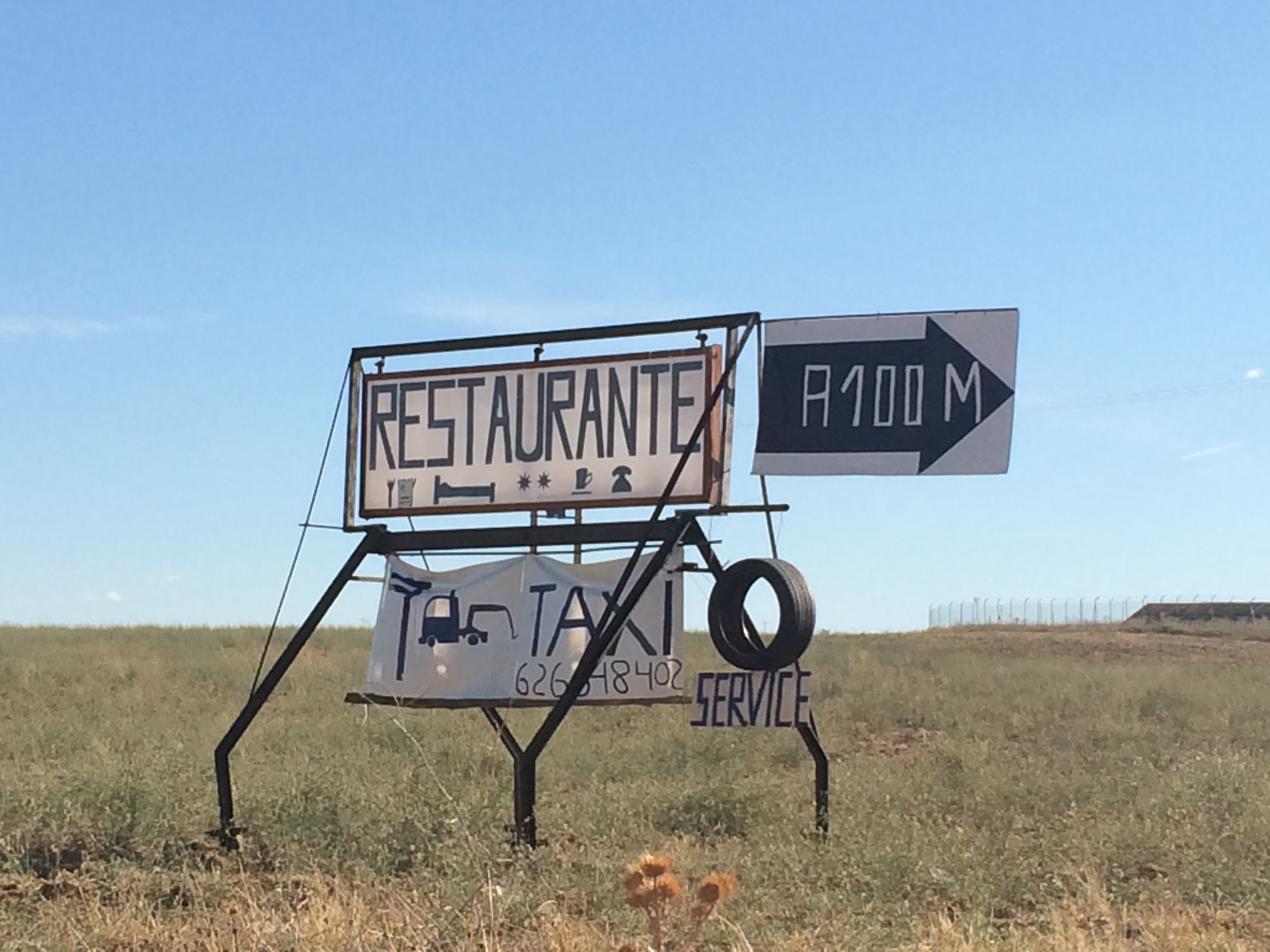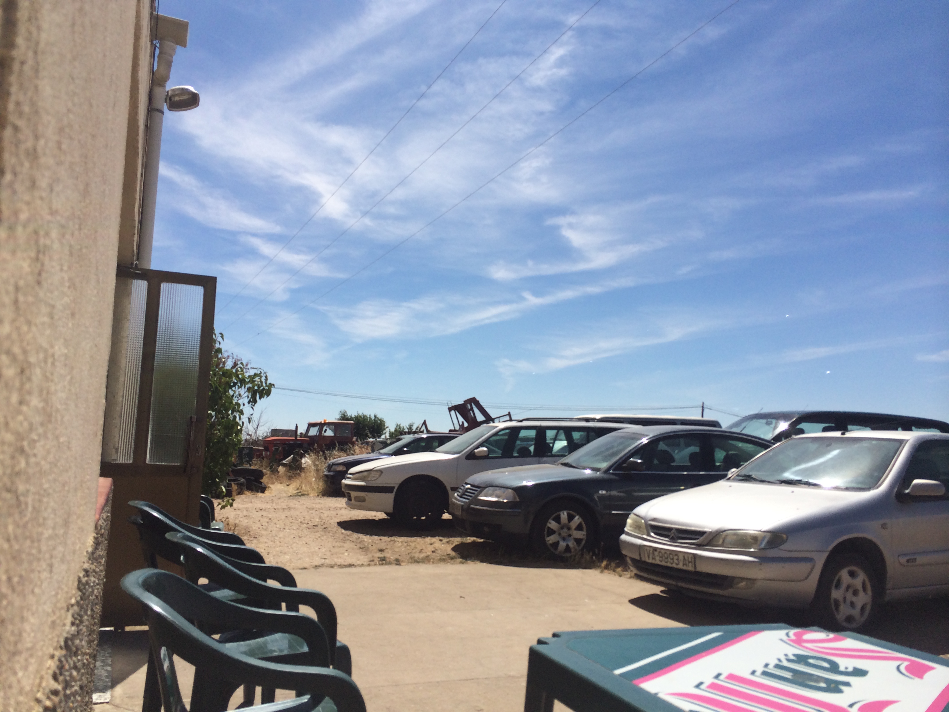 The mechanic returned and had two people waiting for him for other repairs. I waited patiently – he’d get to me when he could, hopefully what he had to say was good news. Eventually he came – he was a short man with a large belly and a happy demeanor. He said in Spanish that he wasn’t able to get a tire because my tire is a special size, but there is another shop that has that size but they are closed until 4 and I think he said he’d go then. Wow. All I could say was “Gracias, gracias” as I put my hands together and nodded in a gesture of respect. I told him as best I could that I would stay here tonight because it would be late. That seemed better for him. He smiled and went back into the garage to continue his work. I went inside and asked the bartender if they had rooms and for how much. €20. More than I want to pay to hang out here, but it is what it is. I ordered a beer and went outside into the shade. The old man next to me was smoking a cigar. I tolerated it begrudgingly because I wanted to be outside. And he seemed not to have much of it left. Or so I thought. Another man, who’d been hanging out pretty much all day as far as I could tell, was giving me a constant eyeball and kinda creeping me out.